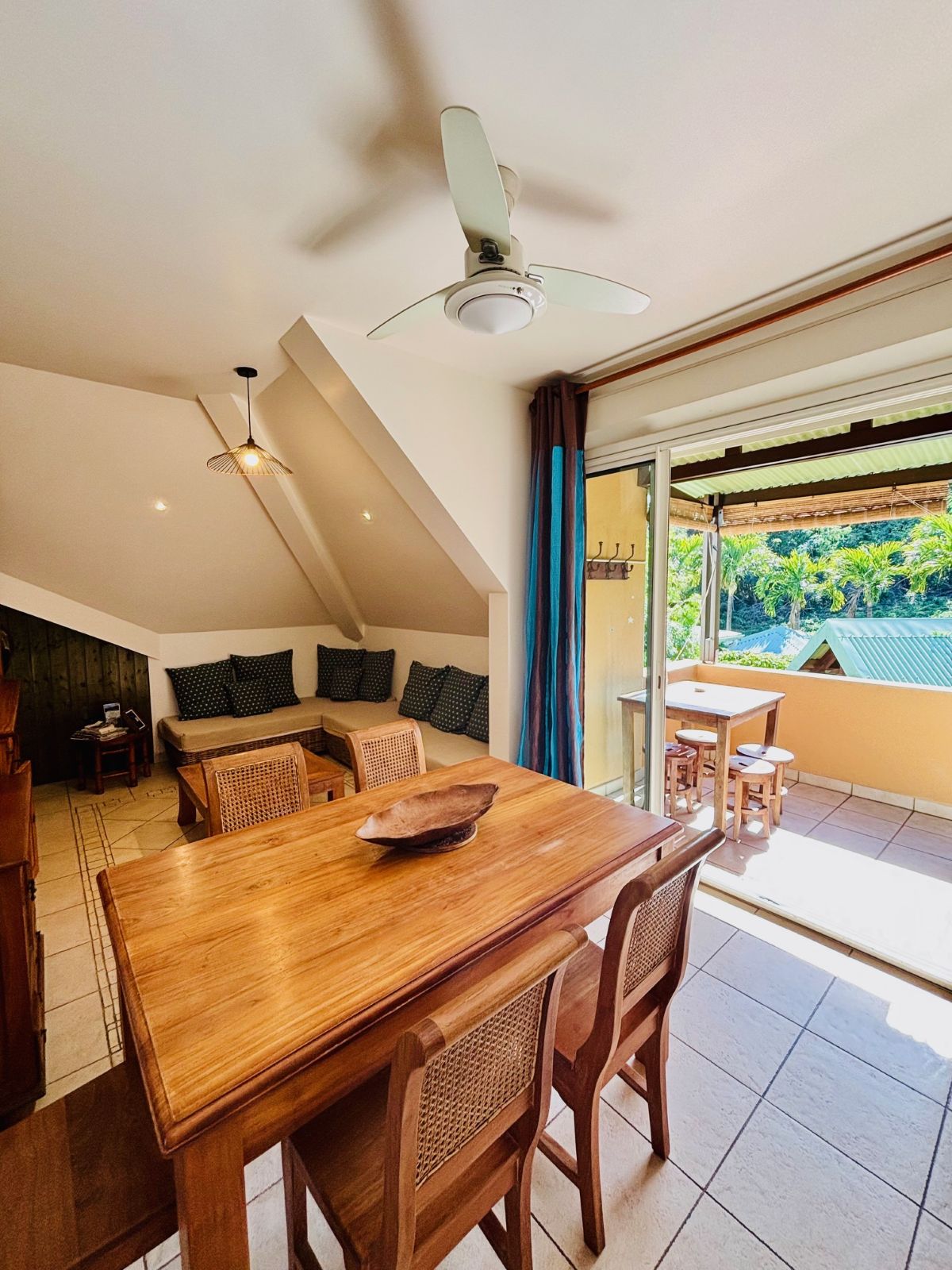 L’appartement dispose d’une petite varangue côté montagne et d’un balcon côté mer offrant une belle vue sur le jardin tropical et l’océan Indien. À l’étage, vous profitez également d’un espace jardin avec barbecue sous les frangipaniers, idéal pour vos repas conviviaux en famille ou entre amis.